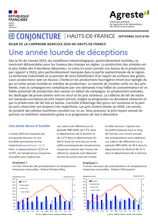 Dès la fin de l’année 2023, les conditions météorologiques, particulièrement humides, se montrent défavorables pour les travaux des champs en région. La production des céréales est la plus faible des 4 dernières décennies. Le colza lui aussi connaît une baisse de la production par rapport à 2023, plus particulièrement marquée dans la partie septentrionale de la région. La betterave industrielle et la pomme de terre bénéficient d’un report de surfaces des grains. Leurs productions sont en hausse. L’herbe et les productions fourragères tirent leur épingle du jeu en cette année humide en matière de production. Le marché de l’endive surfe sur des prix élevés, mais la campagne est compliquée par une demande trop faible du consommateur et un faible potentiel de production des racines en début de campagne. En productions animales, les abattages de jeunes bovins sont en recul et les prix soutenus. La collecte de lait de vache est marquée une baisse du prix moyen annuel, malgré sa progression au deuxième semestre et par la production de lait bio en baisse. L’activité d’abattage des porcs est soutenue et la part du porc charcutier est toujours très majoritaire. Les prix restent élevés en 2024. Les ventes du produit des pêches maritimes reculent sur un an. Sous pression, le prix moyen annuel du poisson se maintient néanmoins grâce à sa progression de mai à décembre.