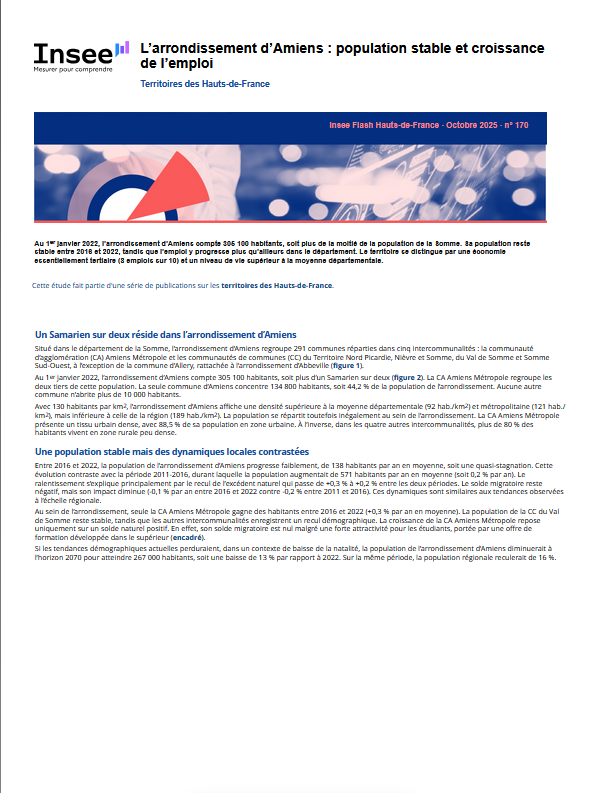 Au 1er janvier 2022, l’arrondissement d’Amiens compte 305 100 habitants, soit plus de la moitié de la population de la Somme. Sa population reste stable entre 2016 et 2022, tandis que l’emploi y progresse plus qu’ailleurs dans le département. Le territoire se distingue par une économie essentiellement tertiaire (8 emplois sur 10) et un niveau de vie supérieur à la moyenne départementale.