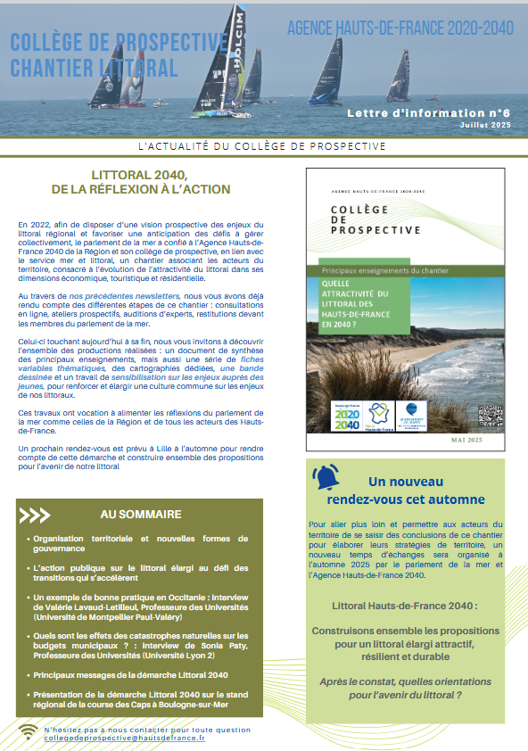 En 2022, afin de disposer d’une vision prospective des enjeux du littoral régional et favoriser une anticipation des défis à gérer collectivement, le parlement de la mer a confié à l’Agence Hauts-de-France 2040 de la Région et son collège de prospective, en lien avec le service mer et littoral, un chantier associant les acteurs du territoire, consacré à l’évolution de l’attractivité du littoral dans ses dimensions économique, touristique et résidentielle.