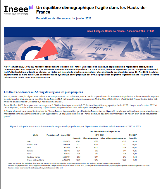 Au 1er janvier 2023, 5 992 200 habitants résident dans les Hauts-de-France. En l’espace de six ans, la population de la région reste stable, tandis qu’elle progresse en moyenne de 0,39 % chaque année en France métropolitaine. Le solde naturel, toujours légèrement positif, compense quasiment le déficit migratoire, qui tend à se réduire. La région est la seule de province à enregistrer plus de départs que d’arrivées entre 2017 et 2023. Seuls les départements du Nord et de l’Oise connaissent une dynamique démographique positive. La population augmente légèrement dans les grands centres urbains mais recule dans les espaces ruraux.